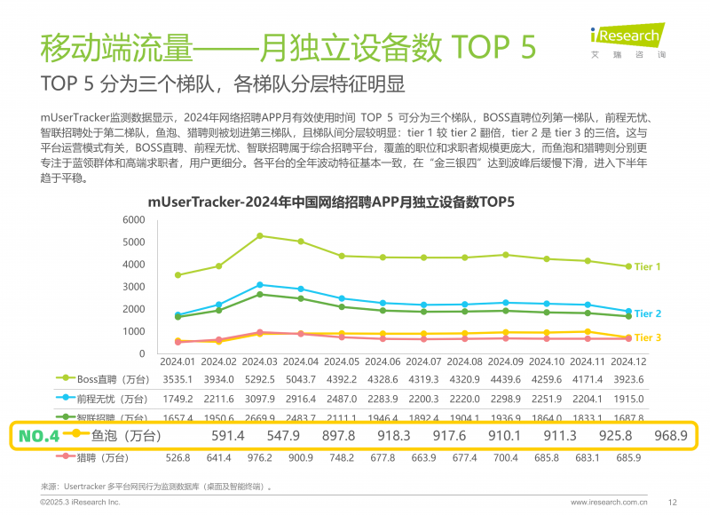 演讲数据显示,正在收集聘请APP月设备数排名中,鱼泡曲聘稳居行业第五位。正在月度总利用次数上,不只稳居第三梯队,更展示出强劲的赶超智联聘请势头。月总无效利用时间方面,鱼泡曲聘自3月成功反超智联聘请后,劣势持续扩大,下半年无效利用时间较上半年实现显著提拔。